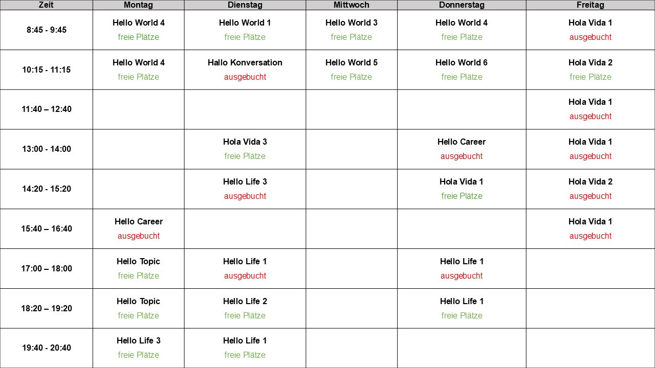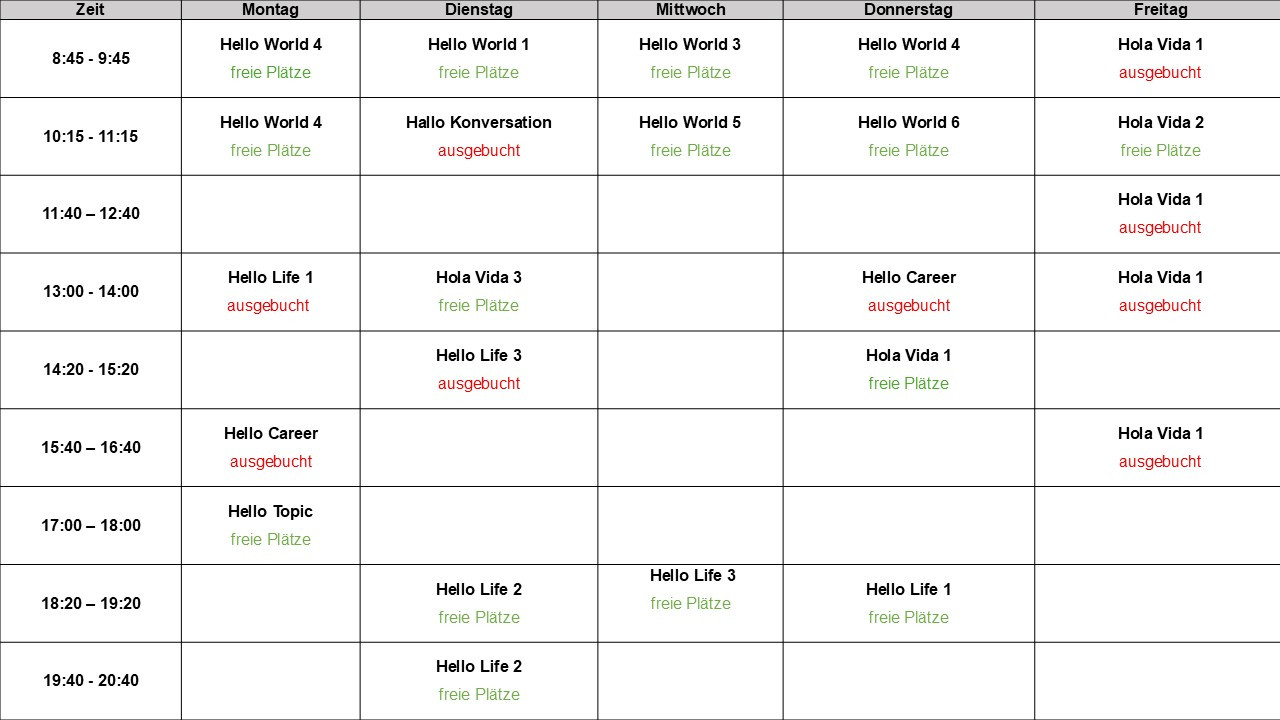 Einsteigen in einen laufenden Gruppenkurs ist jederzeit möglich, vorausgesetzt ein Platz ist frei. Neue Kurse starten jeweils ab einer Teilnehmerzahl von 3 Personen, der Kurstag / die Kurszeit wird in Absprache mit den Teilnehmenden und der Kursleitung festgelegt. Privatlektionen können nach Absprache jederzeit gestartet werden.