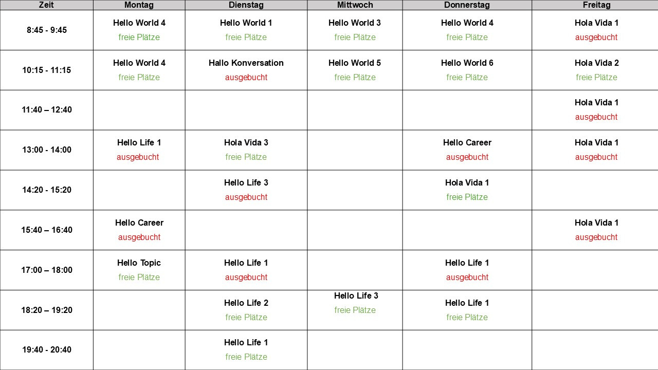 Einsteigen in einen laufenden Gruppenkurs ist jederzeit möglich, vorausgesetzt ein Platz ist frei. Neue Kurse starten jeweils ab einer Teilnehmerzahl von 3 Personen, der Kurstag / die Kurszeit wird in Absprache mit den Teilnehmenden und der Kursleitung festgelegt. Privatlektionen können nach Absprache jederzeit gestartet werden.